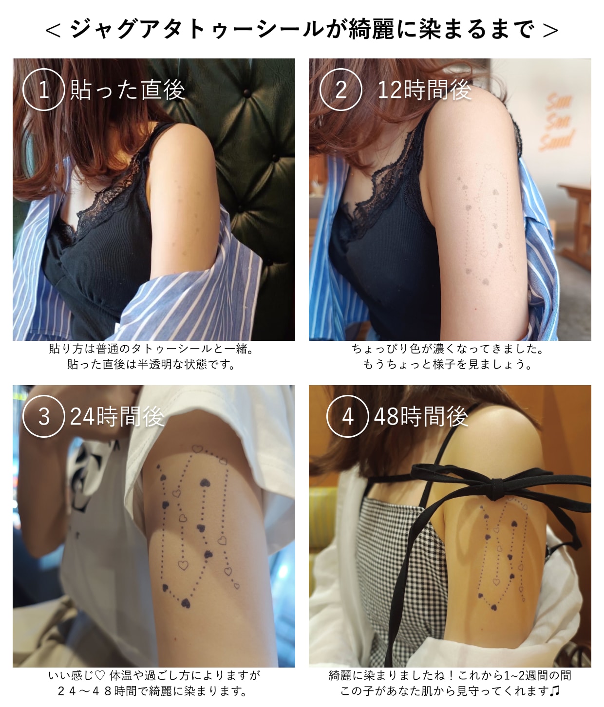 肌を一時的に染めるジャグアタトゥーをシールで楽しめるアイテム、平均2週間ほど肌を染めてくれます。