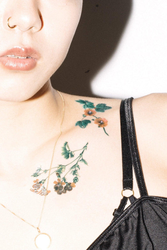 花のデザインのタトゥーシールを集めました。花のデザインは、胸元、腕、型、くるぶしなど、どこに着けても映える万能アイテムです。